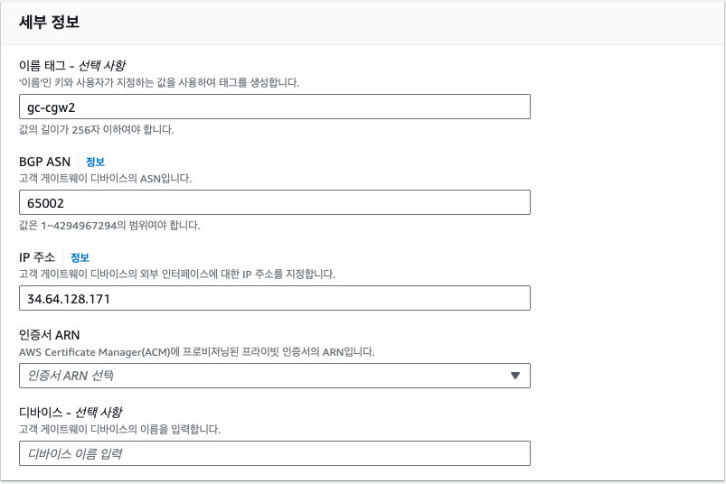 CLIaws ec2 create-customer-gateway --type ipsec.1 --public-ip INTERFACE_0_IP_ADDRESS --bgp-asn GOOGLE_ASNaws ec2 create-customer-gateway --type ipsec.1 --public-ip INTERFACE_1_IP_ADDRESS --bgp-asn GOOGLE_ASNex)aws ec2 create-customer-gateway --type ipsec.1 --public-ip 34.64.64.122 --bgp-asn 65002aws ec2 create-customer-gateway --type ipsec.1 --public-ip 34.64.128.171 --bgp-asn 65002WEB Console