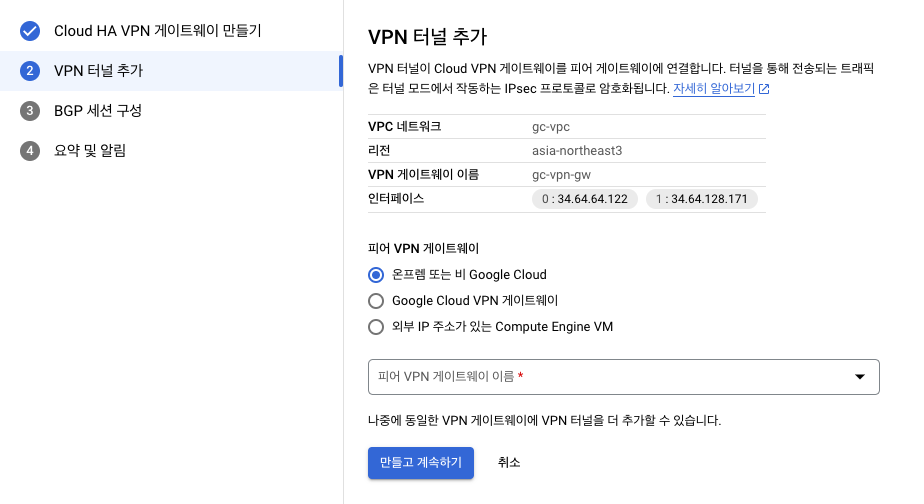 따라서 총 4개의 Outside Public IP를 제공합니다. 이 4개의 IP는 Google Cloud의 Peer Gateway Interface로 등록할 예정입니다.