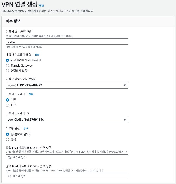 aws ec2 attach-vpn-gateway --vpn-gateway-id VPN_GATEWAY_ID --vpc-id VPC_ID4. Site-to-Site VPN Connection 생성