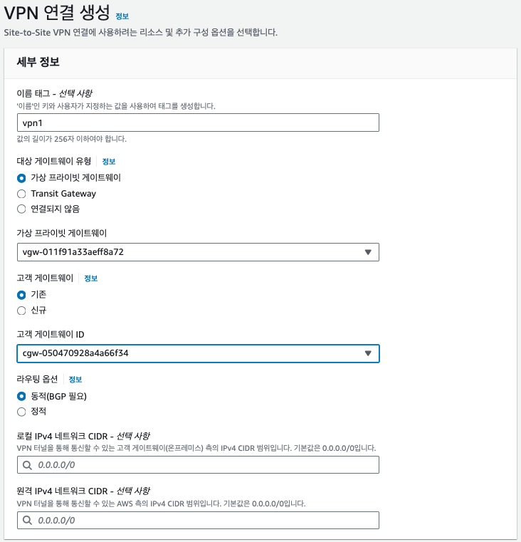 위 아이피는 AWS 의 CGW(Customer Gateway)로 등록될 예정입니다.[AWS]로 돌아가서1. CGW 만들기